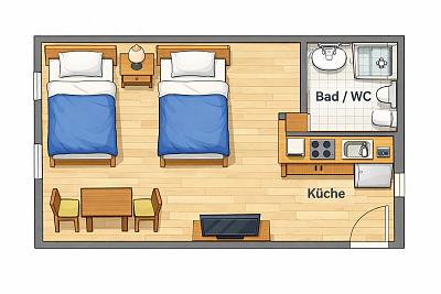 Die Grafik und Beispielbilder zeigen dir die typische Aufteilung der Wohnung, die wir dir anbieten können (Zimmer, Betten, Küche, Essbereich, Bad/WC).